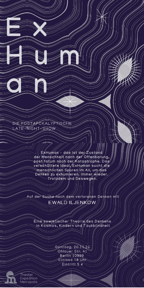 ExHuman: The Post-Apocalyptic Late Night Show invites you to join the conversation once a month. Each month’s theme asks about the exception that proves the rule, about accelerated repetition, about dead dogs and prevented, forgotten, embodied thinking. It is borrowed from philosophy, history, socio-culture, art and literature and opens the discussion using an example (person, novel, film, album, event, etc.). Angie Volk and Sascha Freyberg will be moderating, with Stefan Paul Trzeciok standing by in the background.